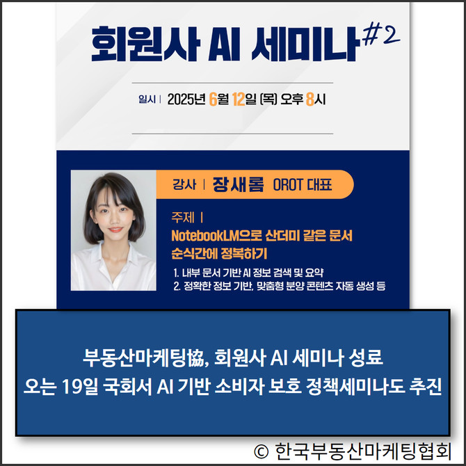 이어 "특히 오는 19일 국회에서 열리는 AI 기반 부동산 소비자 보호 정책세미나를 통해 업계 차원의 AI 활용 방안을 제시하고, 부동산 마케팅 현장에서 즉시 적용 가능한 AI 활용 사례와 교육 프로그램을 지속적으로 마련할 예정"이라고 덧붙였다.