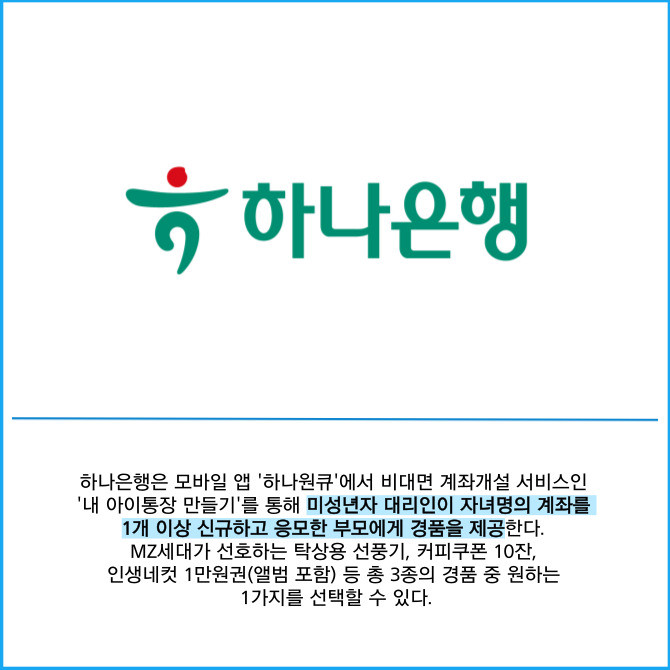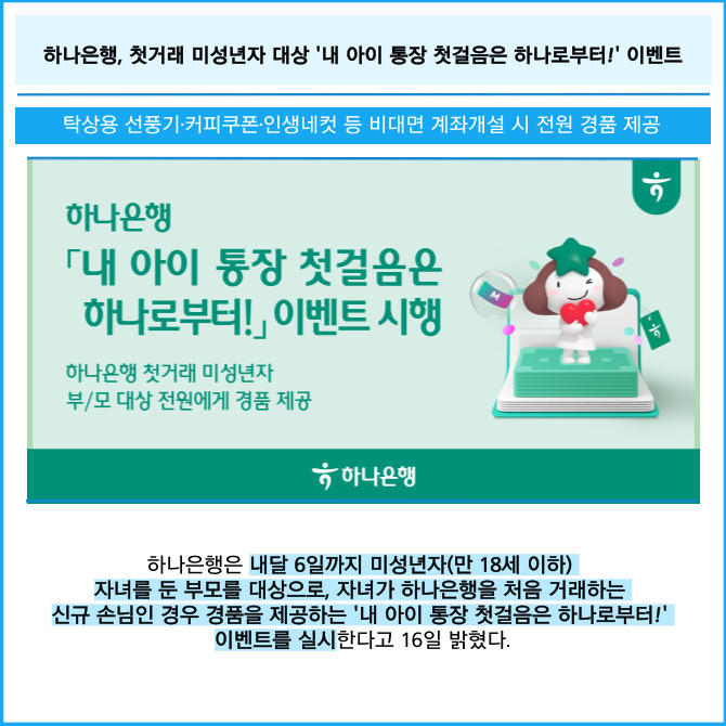 [프라임경제] 하나은행은 내달 6일까지 미성년자(만 18세 이하) 자녀를 둔 부모를 대상으로, 자녀가 하나은행을 처음 거래하는 신규 손님인 경우 경품을 제공하는 '내 아이 통장 첫걸음은 하나로부터!' 이벤트를 실시한다고 16일 밝혔다.