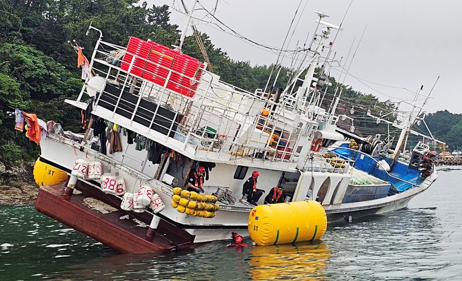 통영해경은 인근에서 안전관리를 실시하면서, 물이 차오르는 만조시간에 맞춰 이초작업을 실시할 계획이다.