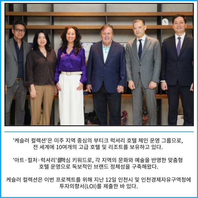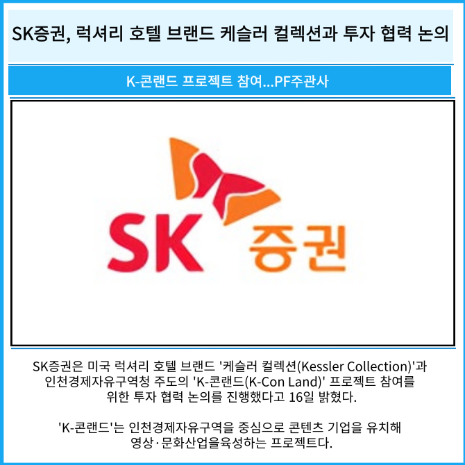 [프라임경제] SK증권(001510)은 미국 럭셔리 호텔 브랜드 '케슬러 컬렉션(Kessler Collection)'과 인천경제자유구역청 주도의 'K-콘랜드(K-Con Land)' 프로젝트 참여를 위한 투자 협력 논의를 진행했다고 16일 밝혔다.