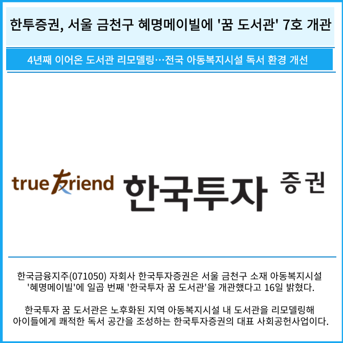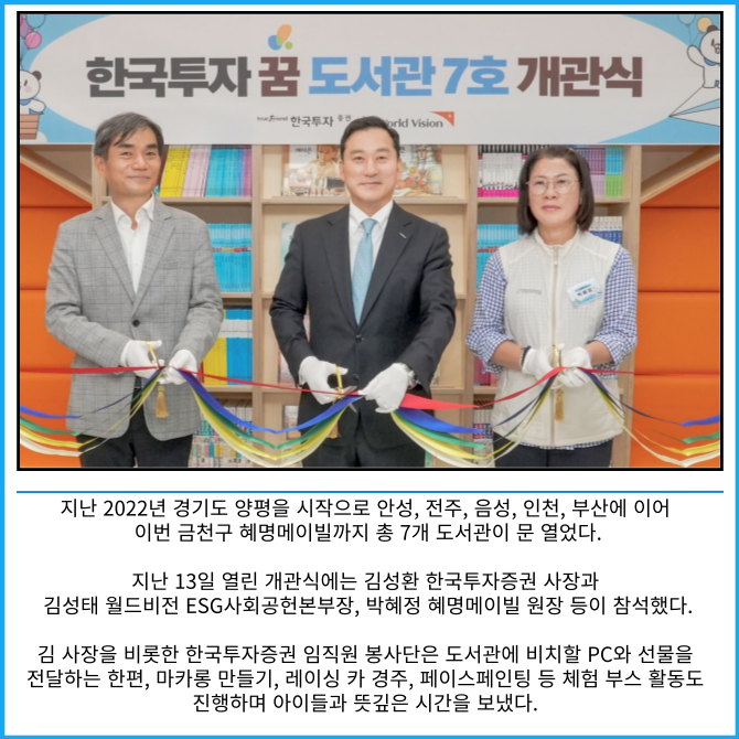 [카드] 한투증권, 서울 금천구 혜명메이빌에 '꿈 도서관' 7호 개관