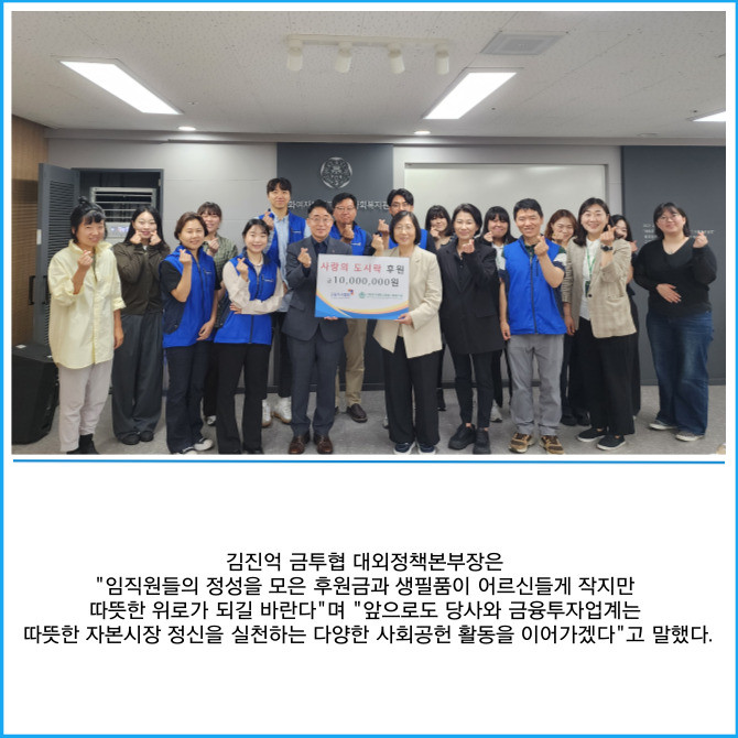 [프라임경제] 금융투자협회(이하 금투협)는 이화여대 종합사회복지관을 방문해 임직원이 마련한 '사랑의 도시락' 후원금 1000만원을 기부하고 지역사회 독거 어르신을 위한 봉사활동을 진행했다고 16일 밝혔다.