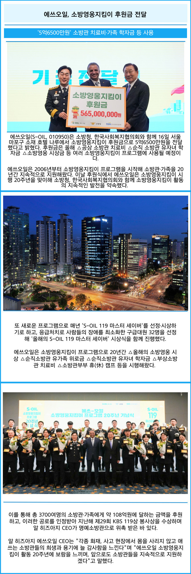 [프라임경제] 에쓰오일(S-OIL, 010950)은 소방청, 한국사회복지협의회와 함께 16일 서울 마포구 소재 호텔 나루에서 소방영웅지킴이 후원금으로 5억6500만원을 전달했다고 밝혔다. 후원금은 올해 △공상 소방관 치료비 △순직 소방관 유자녀 학자금 △소방영웅 시상금 등 여러 소방영웅지킴이 프로그램에 사용될 예정이다.