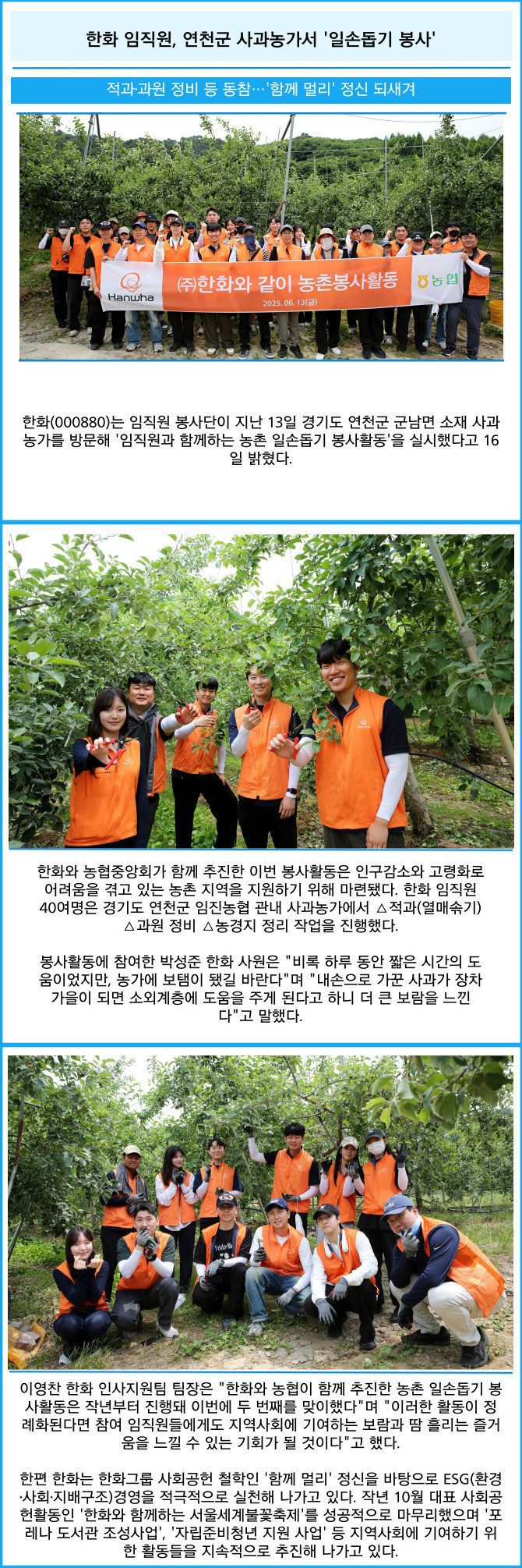 [프라임경제] 한화(000880)는 임직원 봉사단이 지난 13일 경기도 연천군 군남면 소재 사과농가를 방문해 '임직원과 함께하는 농촌 일손돕기 봉사활동'을 실시했다고 16일 밝혔다.