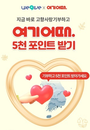 이벤트 기간 동안 서울, 인천, 경기지역을 제외한 지자체로 고향사랑기부제에 참여하는 여기어때 회원에게는 위기브를 통해 기부 시 추가로 5000 포인트가 지급된다. 예를 들어 보령시에 10만원을 기부하면, 연말정산 세액공제 10만원과 3만원 상당의 답례품, 추가 5천 포인트까지 총 13만5000원의 혜택을 받을 수 있다.