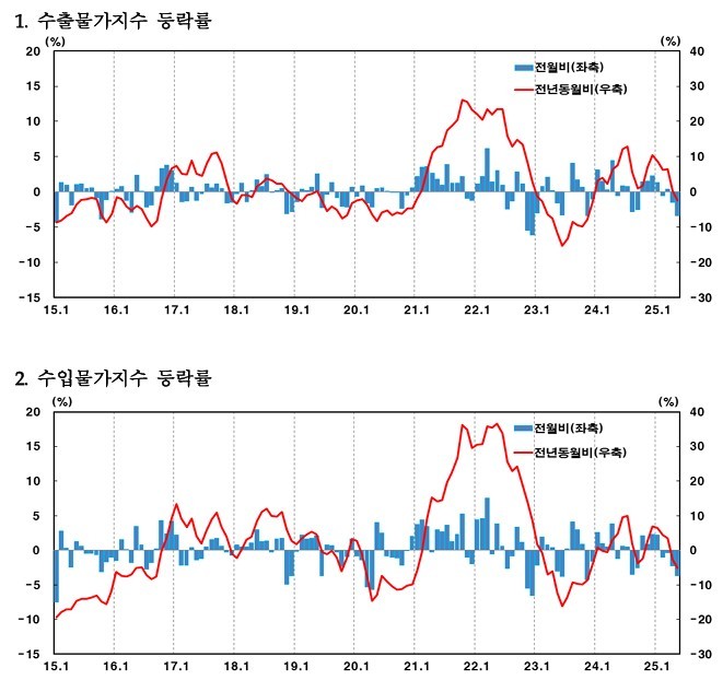 지난달 수출물가지수는 전월 대비 3.4% 하락한 128.56으로 집계됐다. 지난 4월(-1.5%)에 이어 두 달 연속 하락세로, 지난 2023년 11월(-3.4%) 이후 하락 폭이 가장 컸다. 전년 동월 대비로는 2.4% 하락했다.