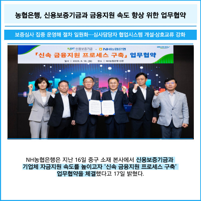[프라임경제] NH농협은행은 지난 16일 중구 소재 본사에서 신용보증기금과 기업체 자금지원 속도를 높이고자 '신속 금융지원 프로세스 구축' 업무협약을 체결했다고 17일 밝혔다.