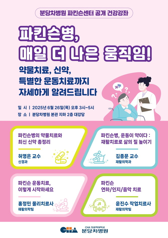 이번 건강강좌는 '파킨슨병, 매일 더 나은 움직임'을 주제로 △파킨슨병 약물 치료와 최신 신약 총정리(분당차병원 신경과 허영은 교수) △파킨슨병, 운동이 약이다: 재활치료로 삶의 질 높이기(분당차병원 재활의학과 김종문 교수) △파킨슨 운동치료, 이렇게 시작하세요(분당차병원 홍정민 물리치료사) △파킨슨 연하/인지/음악치료(분당차병원 윤진수 작업치료사)의 강연이 진행되며 질의응답도 이어진다.