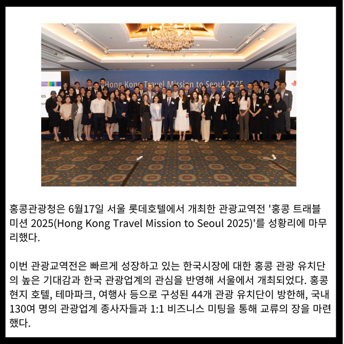 [프라임경제] 홍콩관광청은 6월17일 서울 롯데호텔에서 개최한 관광교역전 '홍콩 트래블 미션 2025(Hong Kong Travel Mission to Seoul 2025)'를 성황리에 마무리했다.