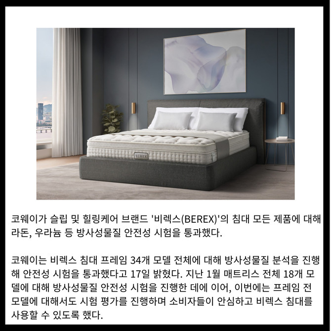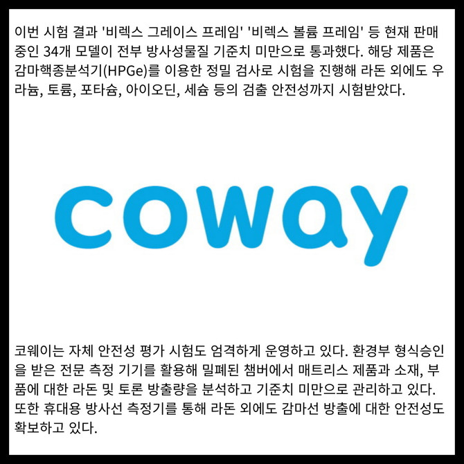 [카드] 코웨이 비렉스 침대 전 제품 라돈 등 방사성물질 안전성 시험 통과