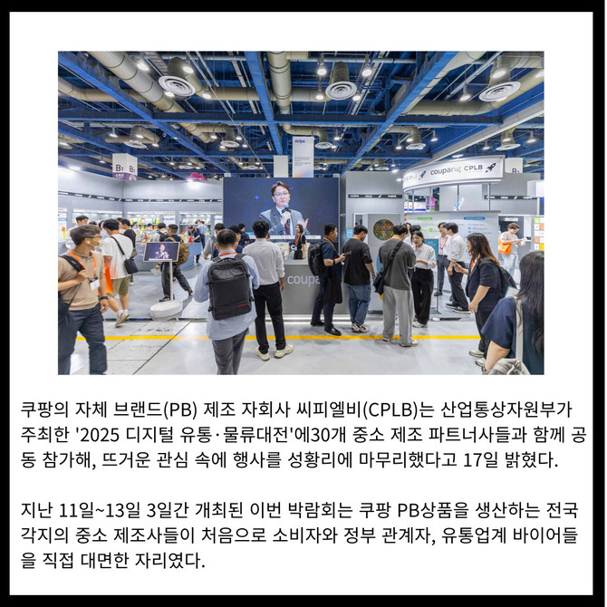 [프라임경제] 쿠팡의 자체 브랜드(PB) 제조 자회사 씨피엘비(CPLB)는 산업통상자원부가 주최한 '2025 디지털 유통·물류대전'에 30개 중소 제조 파트너사들과 함께 공동 참가해, 뜨거운 관심 속에 행사를 성황리에 마무리했다고 17일 밝혔다.
