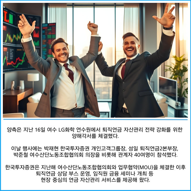 [프라임경제] 한국투자증권은 여수산단노동조합협의회와 퇴직연금 자산운용 관련 협력 관계를 강화하고 근로자를 위한 맞춤형 금융 서비스를 확대한다고 17일 밝혔다.