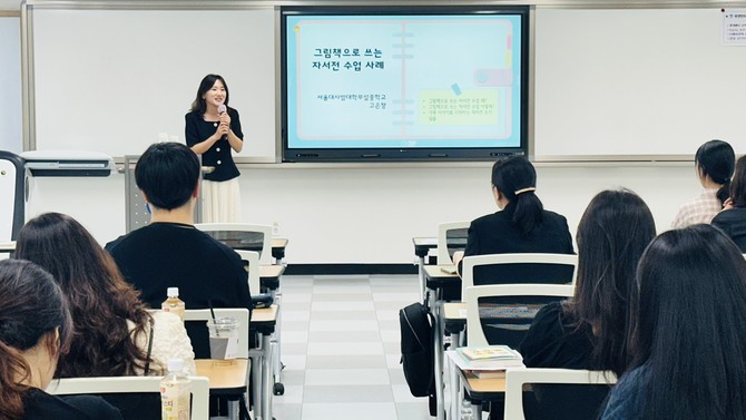 이번 상반기 연수에서는 독서 수업 실천 경험을 엮은 책 '그림책으로 쓰는 자서전 수업'의 저자인 서울대학교사범대학부설중학교 고은정 교사를 강사로 초청했다.