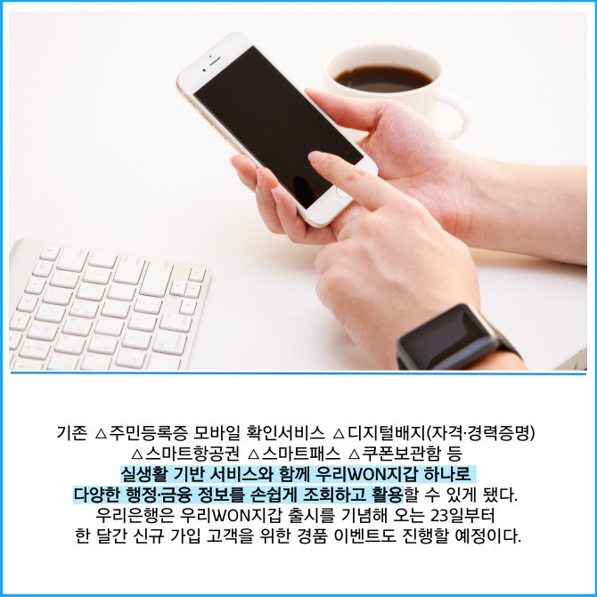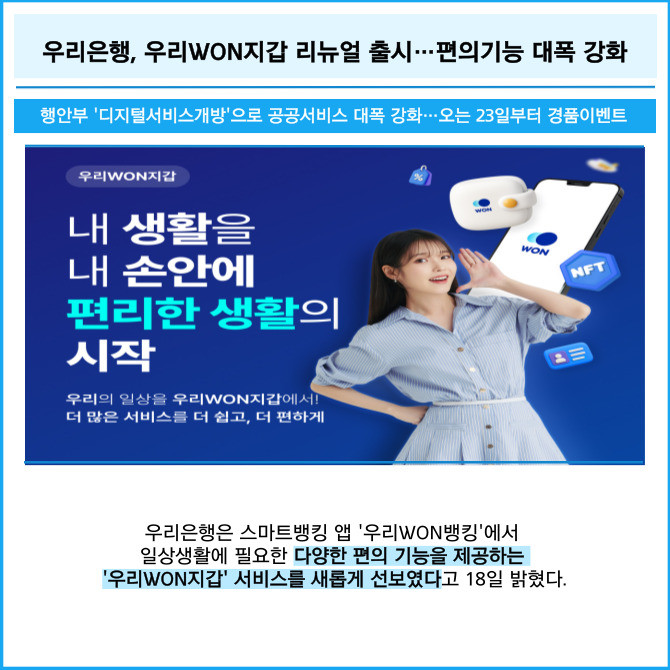 [프라임경제] 우리은행은 스마트뱅킹 앱 '우리WON뱅킹'에서 일상생활에 필요한 다양한 편의 기능을 제공하는 '우리WON지갑' 서비스를 새롭게 선보였다고 18일 밝혔다.