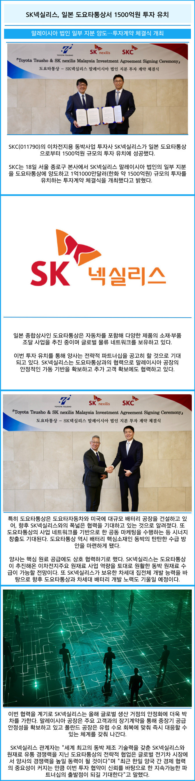 [프라임경제] SKC(011790)의 이차전지용 동박사업 투자사 SK넥실리스가 일본 도요타통상으로부터 1500억원 규모의 투자 유치에 성공했다.
