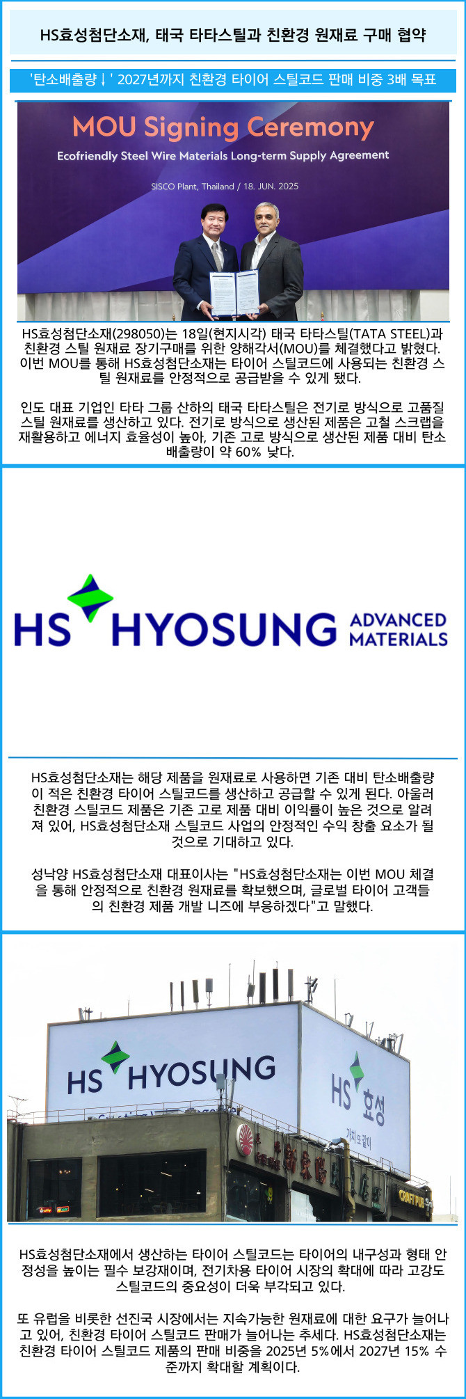 [프라임경제] HS효성첨단소재(298050)는 18일(현지시각) 태국 타타스틸(TATA STEEL)과 친환경 스틸 원재료 장기구매를 위한 양해각서(MOU)를 체결했다고 밝혔다. 이번 MOU를 통해 HS효성첨단소재는 타이어 스틸코드에 사용되는 친환경 스틸 원재료를 안정적으로 공급받을 수 있게 됐다.