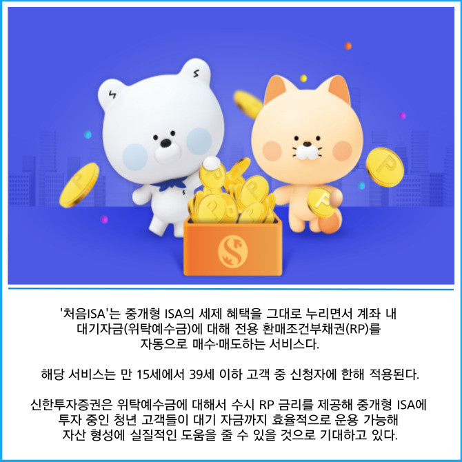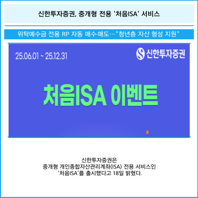 [프라임경제] 신한투자증권은 중개형 개인종합자산관리계좌(ISA) 전용 서비스인 '처음ISA'를 출시했다고 18일 밝혔다.