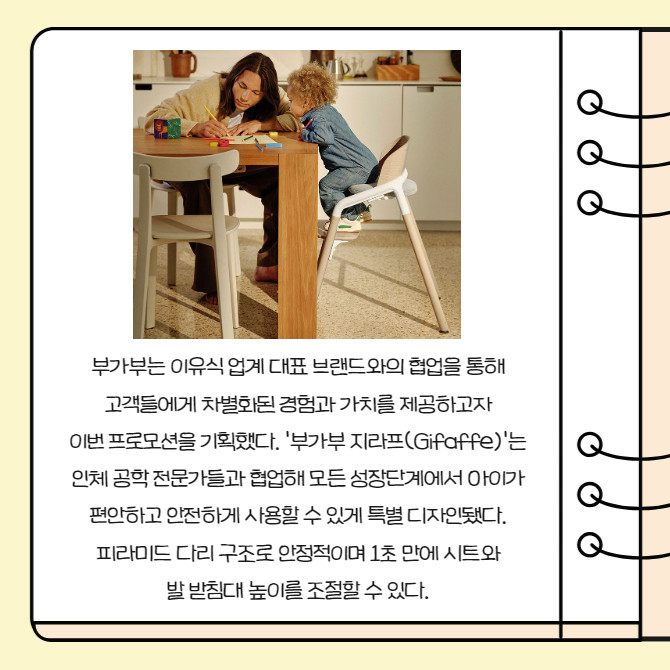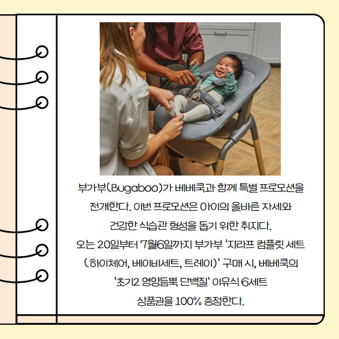 [프라임경제] 부가부(Bugaboo)가 베베쿡과 함께 특별 프로모션을 전개한다. 이번 프로모션은 아이의 올바른 자세와 건강한 식습관 형성을 돕기 위한 취지다. 오는 20일부터 7월6일까지 부가부 '지라프 컴플릿 세트(하이체어, 베이비세트, 트레이)' 구매 시, 베베쿡의 '초기2 영양듬뿍 단백질' 이유식 6세트 상품권을 100% 증정한다.