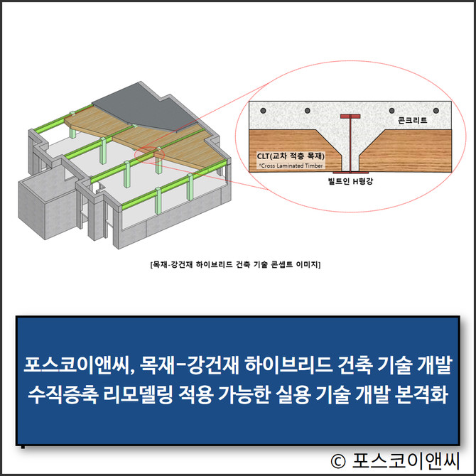 포스코이앤씨가 국립산림과학원과 손잡고 국산 목재와 강건재를 결합한 하이브리드 건축기술을 개발하기 위해 업무협약을 체결했다.