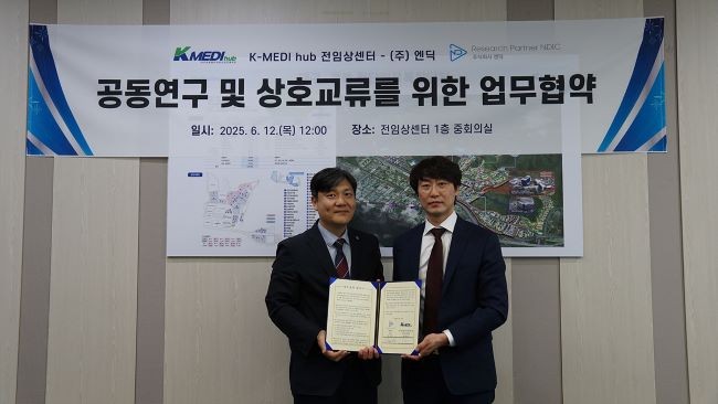 케이메디허브(대구경북첨단의료산업진흥재단, 이사장 박구선) 전임상센터가 지난 12일 주식회사엔딕(대표 임택주)과 연구협력 강화를 위한 전략적 업무협약을 체결했다.