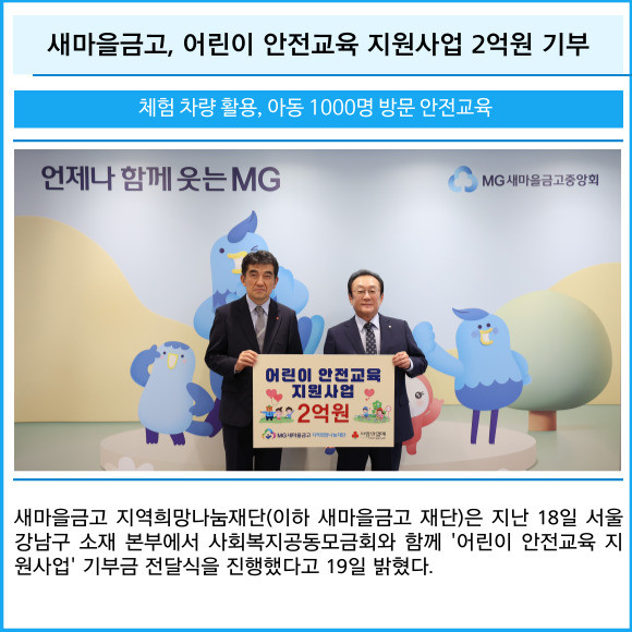 [프라임경제] 새마을금고 지역희망나눔재단(이하 새마을금고 재단)은 지난 18일 서울 강남구 소재 본부에서 사회복지공동모금회와 함께 '어린이 안전교육 지원사업' 기부금 전달식을 진행했다고 19일 밝혔다.