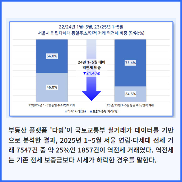 [프라임경제] 올해 들어 서울 연립·다세대 전세 거래 4건 중 1건이 '역전세' 거래인 것으로 나타났다. 지난해 같은 기간에 비해 역전세 비중은 다소 줄었지만, 여전히 전세가 하락 여파가 지속되고 있다는 분석이다.