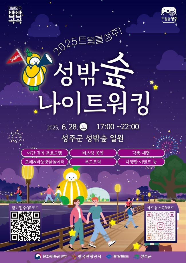[프라임경제] 성주군은 야간관광 특화도시 조성사업의 일환으로 오는 28일 성밖숲 및 용산이천길 일원에서 '트윙클 성주! 성밖숲 나이트 워킹'행사를 개최한다.