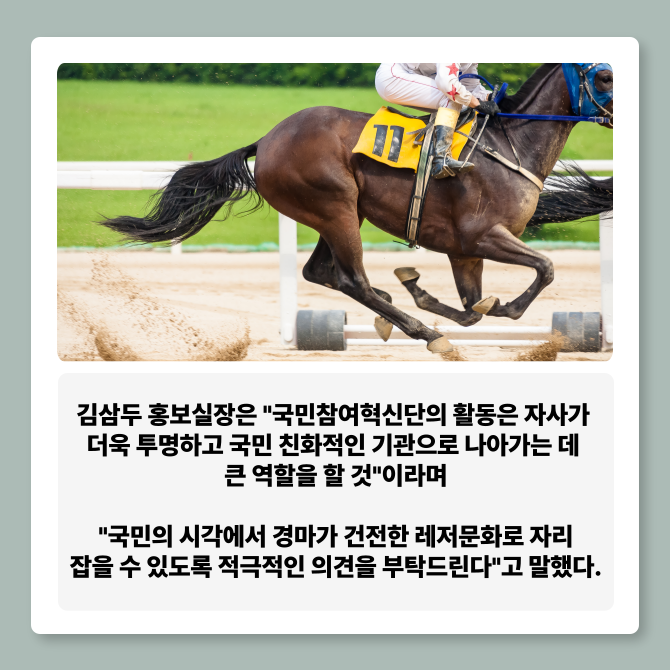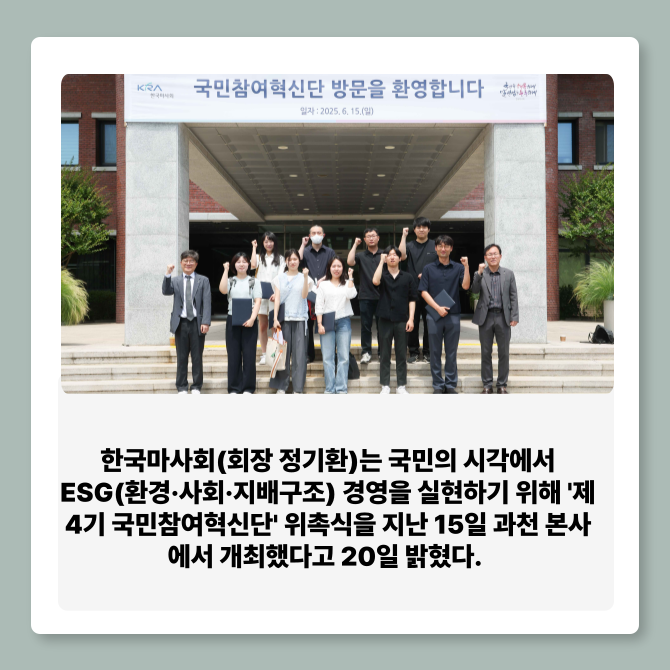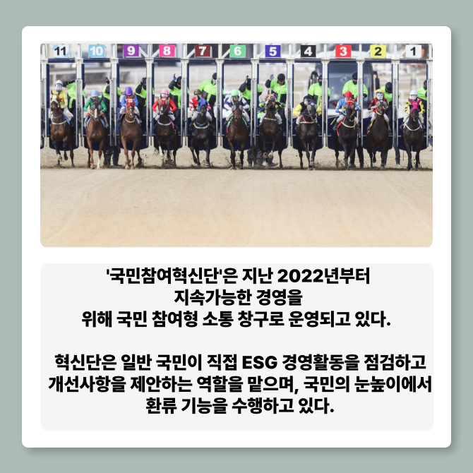[프라임경제] 한국마사회(회장 정기환)는 국민의 시각에서 ESG(환경·사회·지배구조) 경영을 실현하기 위해 '제4기 국민참여혁신단' 위촉식을 지난 15일 과천 본사에서 개최했다고 20일 밝혔다.