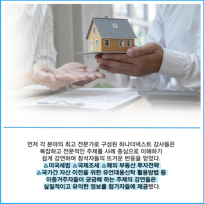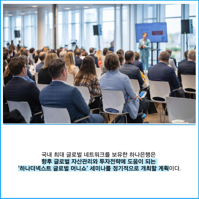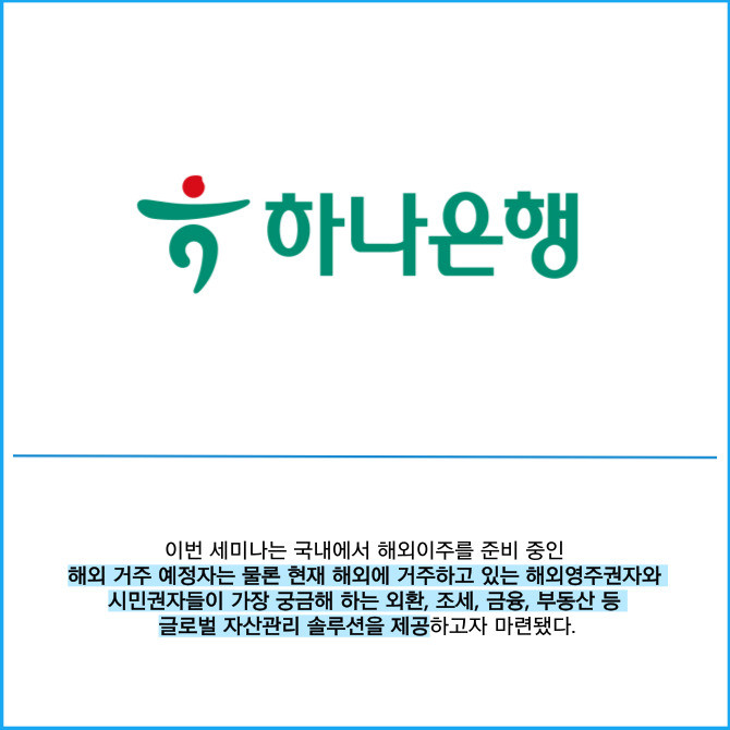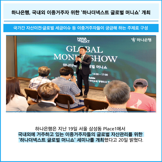 [프라임경제] 하나은행은 지난 19일 서울 삼성동 Place1에서 국내외에 거주하고 있는 이중거주자들의 글로벌 자산관리를 위한 '하나더넥스트 글로벌 머니쇼' 세미나를 개최했다고 20일 밝혔다.