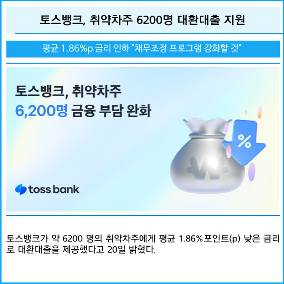 [프라임경제] 토스뱅크가 약 6200 명의 취약차주에게 평균 1.86%포인트(p) 낮은 금리로 대환대출을 제공했다고 20일 밝혔다.