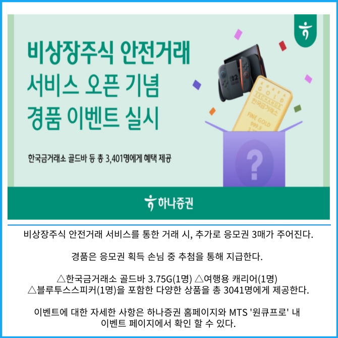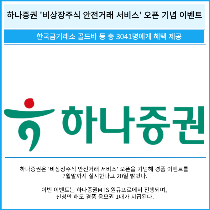 [프라임경제] 하나증권은 '비상장주식 안전거래 서비스' 오픈을 기념해 경품 이벤트를 7월말까지 실시한다고 20일 밝혔다.