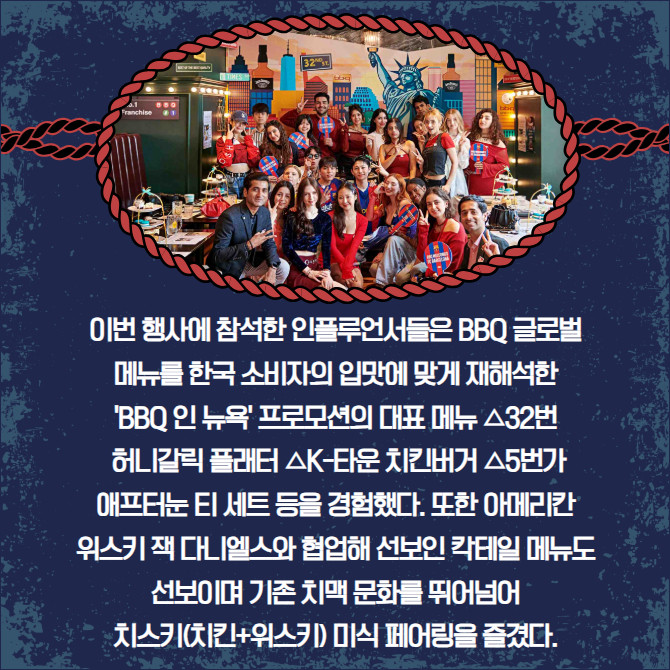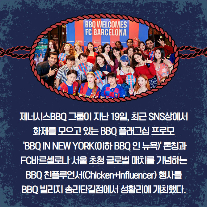 [프라임경제] 제너시스BBQ 그룹이 지난 19일, 최근 SNS상에서 화제를 모으고 있는 BBQ 플래그십 프로모션 'BBQ IN NEW YORK(이하 BBQ 인 뉴욕)' 론칭과 FC바르셀로나 서울 초청 글로벌 매치를 기념하는 BBQ 친플루언서(Chicken+Influencer) 행사를 BBQ 빌리지 송리단길점에서 성황리에 개최했다.