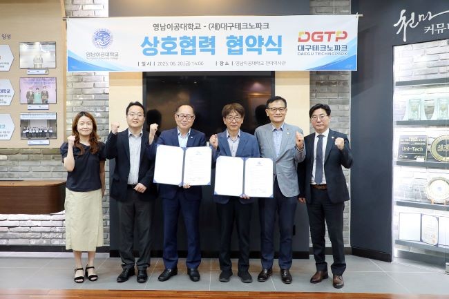 협약식에는 이재용 총장을 비롯해 권기홍 교학부총장, 박민규 산학협력단장 등 영남이공대학교 주요 보직자들과, 김한식 원장, 석경호 기업지원단장 등 대구테크노파크 관계자들이 참석해 상호협력의 중요성과 기대를 함께 나눴다.