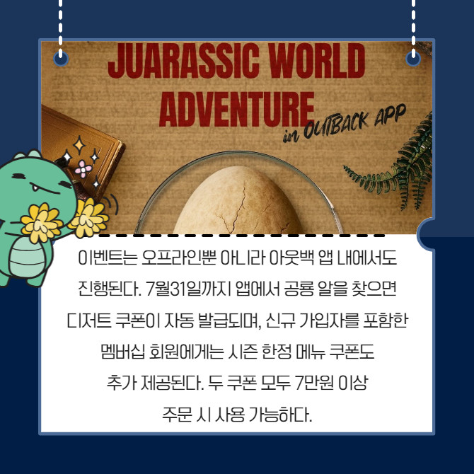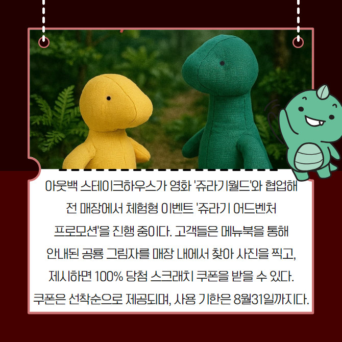 [프라임경제] 아웃백 스테이크하우스가 영화 '쥬라기월드'와 협업해 전 매장에서 체험형 이벤트 '쥬라기 어드벤처 프로모션'을 진행 중이다. 고객들은 메뉴북을 통해 안내된 공룡 그림자를 매장 내에서 찾아 사진을 찍고, 제시하면 100% 당첨 스크래치 쿠폰을 받을 수 있다. 쿠폰은 선착순으로 제공되며, 사용 기한은 8월31일까지다.