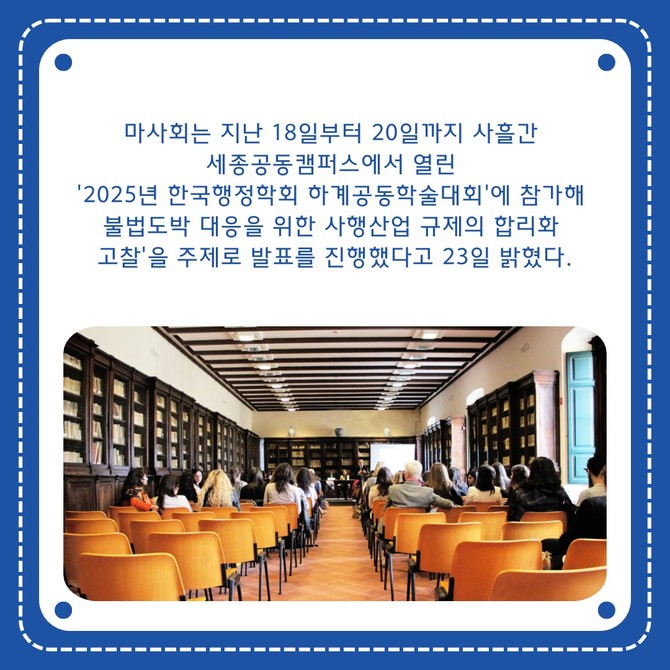마사회는 지난 18일부터 20일까지 사흘간 세종공동캠퍼스에서 열린 '2025년 한국행정학회 하계공동학술대회'에 참가해 불법도박 대응을 위한 사행산업 규제의 합리화 고찰'을 주제로 발표를 진행했다고 23일 밝혔다.
