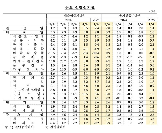 한국은행(이하 한은)이 23일 발표한 '2025년 1분기 기업경영분석' 결과에 따르면 외부감사 대상 법인기업 2만3137개(제조업 1만1651개·비제조업 1만1486개)의 1분기 매출은 전년 동기 대비 2.4% 증가했다.