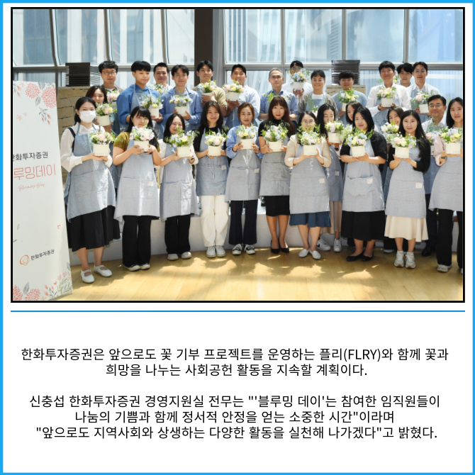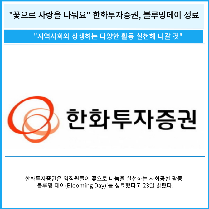 [프라임경제] 한화투자증권은 임직원들이 꽃으로 나눔을 실천하는 사회공헌 활동 '블루밍 데이(Blooming Day)'를 성료했다고 23일 밝혔다.