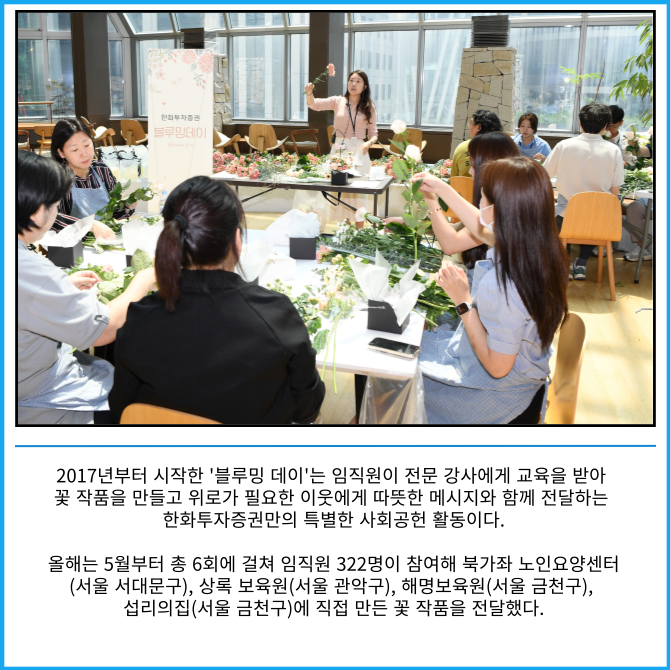 2017년부터 시작한 '블루밍 데이'는 임직원이 전문 강사에게 교육을 받아 꽃 작품을 만들고 위로가 필요한 이웃에게 따뜻한 메시지와 함께 전달하는 한화투자증권만의 특별한 사회공헌 활동이다.