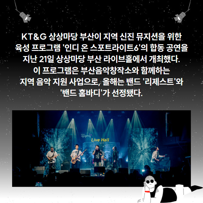 [프라임경제] KT&G(033780) 상상마당 부산이 지역 신진 뮤지션을 위한 육성 프로그램 '인디 온 스포트라이트6'의 합동 공연을 지난 21일 상상마당 부산 라이브홀에서 개최했다. 이 프로그램은 부산음악창작소와 함께하는 지역 음악 지원 사업으로, 올해는 밴드 '리제스트'와 '밴드 홈바디'가 선정됐다.