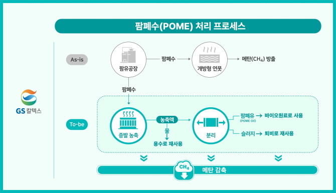 GS칼텍스는 인도네시아 최초로 팜폐수 증발 농축 처리시설을 도입해 팜폐수 부패를 억제함으로써 메탄 발생을 감축시키고, 팜폐수를 재활용해 팜폐유(POME Oil)를 회수할 계획이다. 팜폐유는 지속가능항공유(SAF) 등 바이오연료에 활용할 수 있다. 처리 과정 중 함께 회수되는 물과 슬러지(침전물)는 팜농장 용수와 퇴비로 재사용한다.