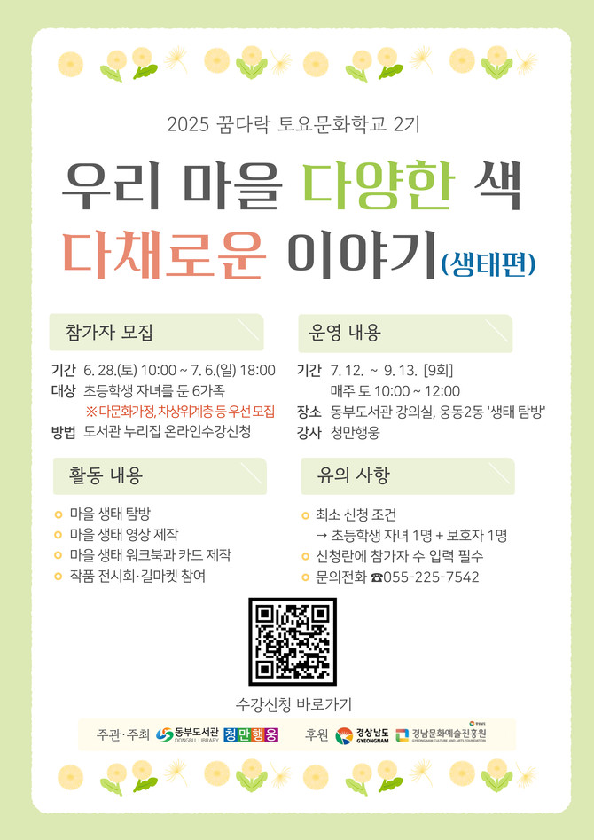 [프라임경제] 창원시 동부도서관은 '2025년 꿈다락 토요문화학교' 2기 프로그램 수강생을 오는 6월28일부터 동부도서관 누리집을 통해 선착순 모집한다.