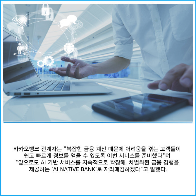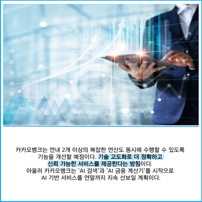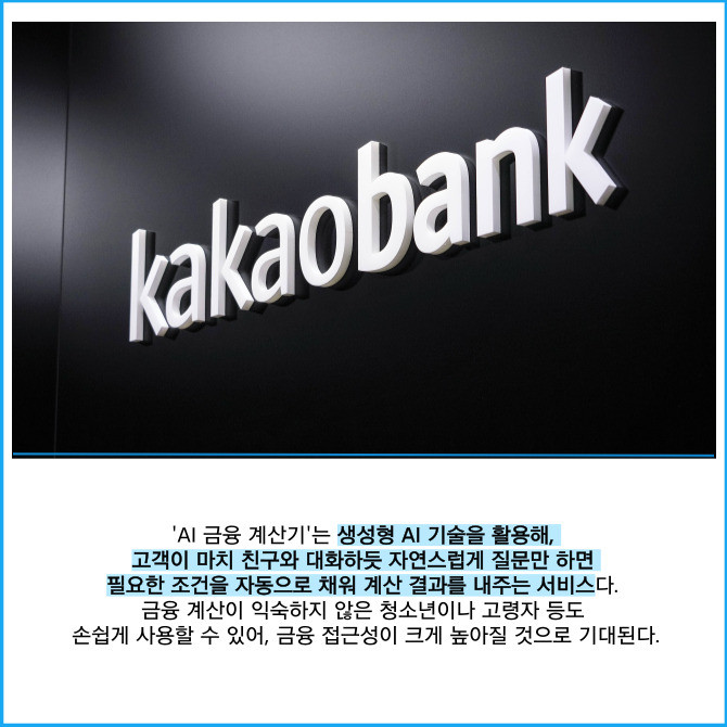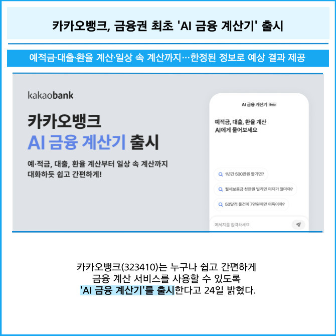 [프라임경제] 카카오뱅크(323410)는 누구나 쉽고 간편하게 금융 계산 서비스를 사용할 수 있도록 'AI 금융 계산기'를 출시한다고 24일 밝혔다.