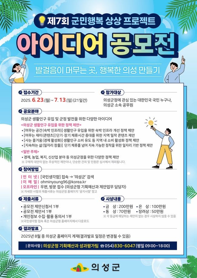 [프라임경제] 의성군(군수 김주수)은 오는 7월13일까지 '제7회 군민행복 상상프로젝트 아이디어 공모전'(부제: 발걸음이 머무는 곳, 행복한 의성 만들기)을 개최한다.