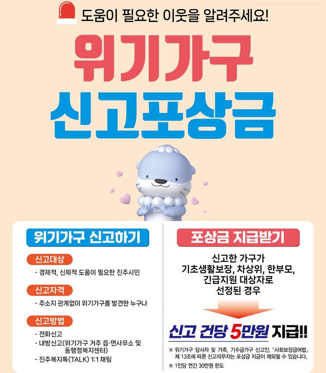 '진주시 위기가구 신고포상금 제도'는 경제적-신체적 도움이 필요한 시민을 대상으로 위기가구 발견 신고가 접수되면 시는 읍면동 상담을 통해 대상자에게 필요한 공공급여나 민간서비스 등을 연계 지원하고, 발굴된 위기가구 △기초생활보장수급자 △차상위계층 △한부모가족 △긴급지원대상자로 선정될 경우 신고자에게 포상금 5만원을 지급한다.