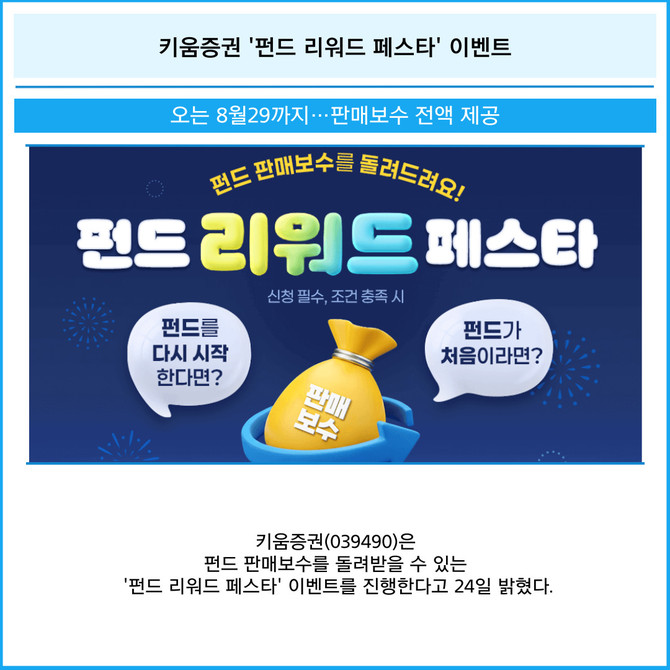 [프라임경제] 키움증권(039490)은 펀드 판매보수를 돌려받을 수 있는 '펀드 리워드 페스타' 이벤트를 진행한다고 24일 밝혔다.