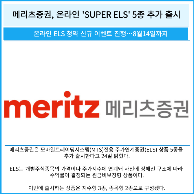 [프라임경제] 메리츠증권은 모바일트레이딩시스템(MTS)전용 주가연계증권(ELS) 상품 5종을 추가 출시한다고 24일 밝혔다.