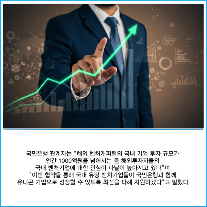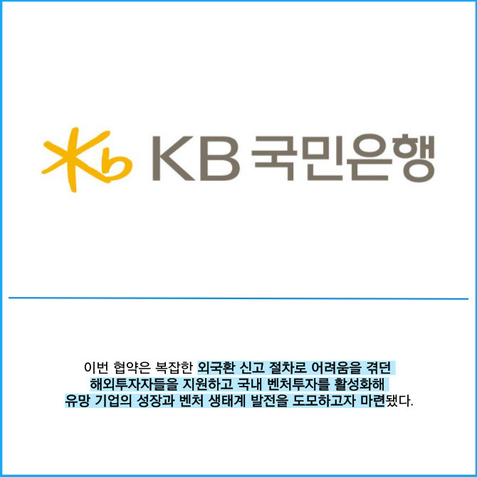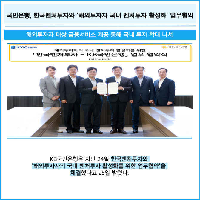 [프라임경제] KB국민은행은 지난 24일 한국벤처투자와 '해외투자자의 국내 벤처투자 활성화를 위한 업무협약'을 체결했다고 25일 밝혔다.