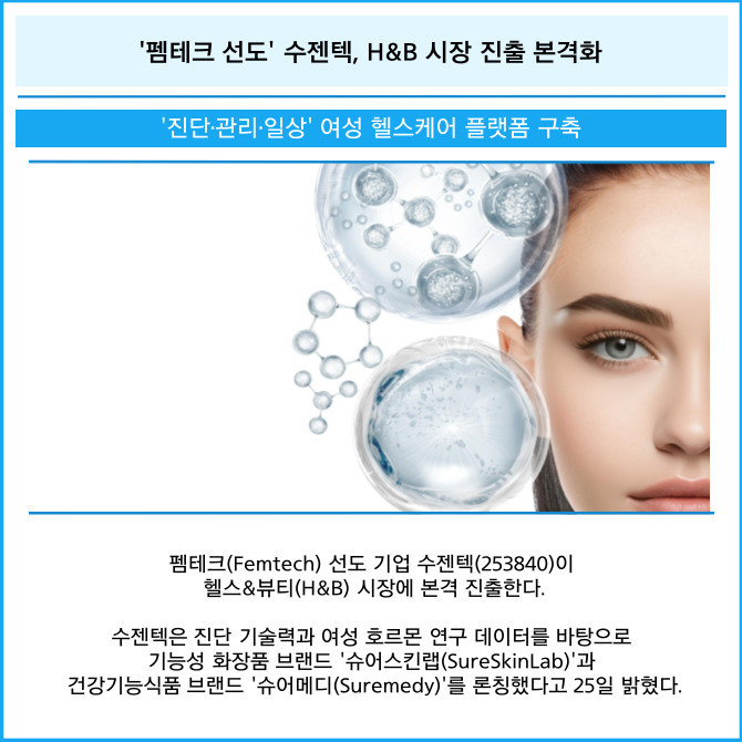 [프라임경제] 펨테크(Femtech) 선도 기업 수젠텍(253840)이 헬스&뷰티(H&B) 시장에 본격 진출한다.