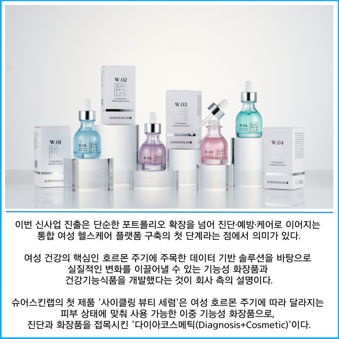 수젠텍은 진단 기술력과 여성 호르몬 연구 데이터를 바탕으로 기능성 화장품 브랜드 '슈어스킨랩(SureSkinLab)'과 건강기능식품 브랜드 '슈어메디(Suremedy)'를 론칭했다고 25일 밝혔다.