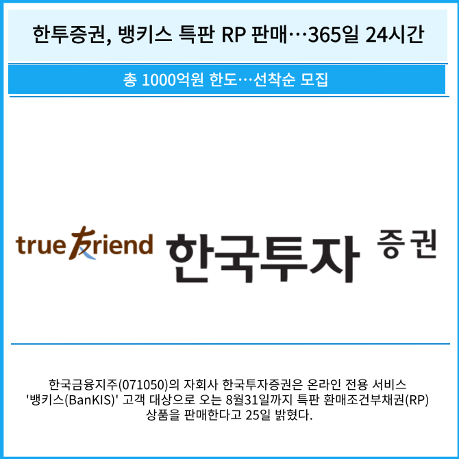 [프라임경제] 한국금융지주(071050)의 자회사 한국투자증권은 온라인 전용 서비스 '뱅키스(BanKIS)' 고객 대상으로 오는 8월31일까지 특판 환매조건부채권(RP) 상품을 판매한다고 25일 밝혔다.